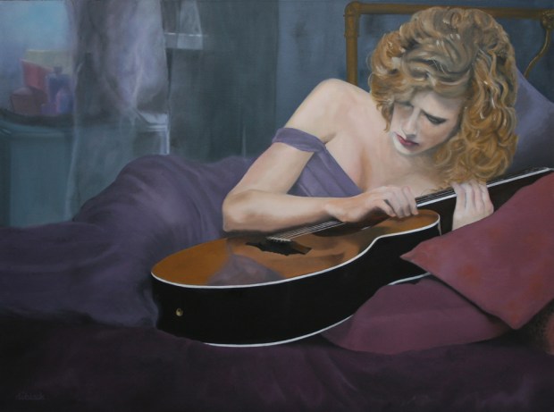 This recently completed painting is based on a photograph of Taylor Swift, the American country pop singer/songwriter, musician and actress. In order to give it a ‘bluesy’ feel I changed the colour palette, substituting the colder shades of blue and purple for the original’s much warmer tones.
