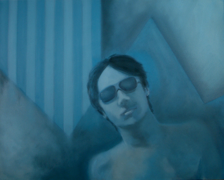 My original intention when I started this painting was to produce an abstract piece. After working on it for a while however, I decided that the idea wasn’t going anywhere. The vertical blue and whites stripes were suggestive of the ultra violet emitting flourescent tubes used in sunbeds, so I added the figure of a guy wearing sunglasses. I had employed a colour palette from the cooler end of the spectrum and this provided me with a title for the work.